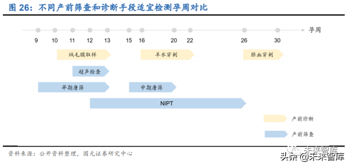 相比传统血清学唐筛,NIPT 扩大检测时间窗口,安全性、特异性、敏感性大幅提高。孕妇产前筛查和产前诊断不同,前者的目的是在健康人群中筛查出高风险孕妇,进而 通过羊水穿刺、脐带血穿刺等侵入性诊断方法进行确诊,从而避免 21 三体综合征等 胎儿遗传病的发生。目前我国临床上针对染色体非整倍体的筛查手段包括超声检查、 血清学唐氏筛查和无创产前 DNA 检测(NIPT),前两种方法存在较高的假阳性率和 漏诊率,血清学唐氏筛查作为传统的产前筛查手段,根据孕周大小分为早期筛查(9- 13 周)和中期筛查(15-20 周),早孕期联合超声波 NT 的唐筛筛查染色体异常的检 出率约为 70%-80%,中孕期筛查的检出率约为 65%-70%,仍存在明显不足。高特 异性的 NIPT 很好地弥补了这两种方法的缺陷,已有报道显示,NIPT 应用于染色体 非整倍体异常胎儿检测的敏感性为 91.7%-100%,特异性为 97.9%-100%。NIPT 检 测时间窗口较宽,适用于孕 12-26 周,早于 12 周孕妇血中胎儿 DNA 含量较低,可 能会导致检测存在误差。