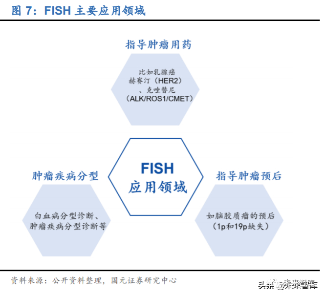 FISH 是一种利用非放射性的荧光信号对原位杂交样本进行检测的技术,主要用于指 导肿瘤靶向药物使用、肿瘤预后、肿瘤疾病分型诊断等领域,是检测 HER-2 基因状 态的金标准,目前在大多数省份和地区已经纳入医保。FISH 全称荧光原位杂交技术, 原理是利用已知的 DNA 变异序列,与被检测的样本 DNA 序列杂交、互补配对,从 而发现样本 DNA 的异常情况,主要用于了解基因或染色体是否发生扩增、缺失、融 合或断裂,检测样本来源广泛(组织、脱落细胞、羊水、血液、骨髓等),且不仅限 于新鲜样本,2-3 年的石蜡样本都可以检测;同时,FISH 检测成本较低而且在大多 数省份和地区都被纳入医保范畴。FISH 应用最多的场景是 DNA 扩增检测,《2014 年 NCCN 乳腺癌临床实践指南》和《乳腺癌 HER2 检测指南 2014 版》均指出 FISH 是 检测 HER2 基因状态的“金标准”,目前 Roche、Abbot 等研发的 HER-2 扩增检测 试剂盒已获得 FDA 批准。