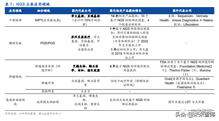 (1) 无创产前检测(NIPT):是 NGS 临床应用最为成熟的领域,国内 NIPT 检测 价格大多在 800-2400 元之间,深圳、天津等地区已经将 NIPT 纳入医保,未 来随着价格不断降低以及对 NIPT 认知度提升,渗透率或稳步上升。国内目 前共 10 个基于 NGS 的 NIPT 检测试剂盒获批上市,其中华大基因和贝瑞基 因先发优势明显,占据 70%的市场份额,形成双寡头竞争格局。国外代表公 司包括美国Sequenom、Natera、Verinata和Ariosa以及欧洲的LifeCodexx。