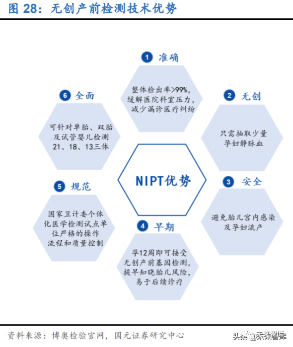 NIPT 以高通量测序(NGS)为主,具有无创、检出率高、流产风险低等优势。基于 母体外周血胎儿游离 DNA(cfDNA)和高通量测序(NGS)等技术的无创产前检测 (NIPT)是基因测序在生育健康领域的重要应用,检测原理是通过采取孕妇静脉血, 利用高通量测序技术(NGS)对母体外周血浆中的游离 DNA 片段(包括胎儿游离 DNA)进行测序,并将测序结果进行生物信息分析、从中得到胎儿的遗传信息,从而 检测胎儿是否有染色体异常的疾病,主要用于 3 种染色体数目异常遗传疾病:21 三 体综合征(唐氏综合征)、18 三体综合征(爱德华氏综合征)、13 三体综合征(帕陶 综合征)。NIPT 具有无创、检出率高、漏诊率低、检测周期短、流产风险低、操作简 便等多方面优势:(1)NIPT 只需抽取 5-10ml 母体静脉血,属于非侵入式检查,从 而避免了流产风险和宫内感染的可能性;(2)基于 NGS 的 NIPT 检测准确率较高, 其中对于 21 三体综合征的检出率达到 99%以上,且怀孕 12 周即可接受 NIPT,能 够尽早发现问题、及早预防。