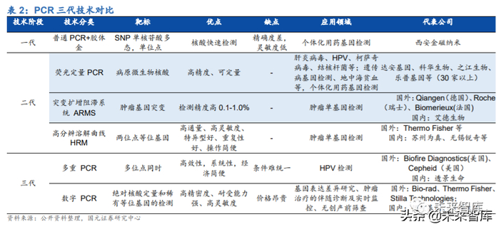 PCR 经过三代技术更迭,精确度和灵敏度不断提高。PCR 技术最早由穆勒于 1985 年发明,经历了第一代定性 PCR、第二代定量 PCR 和数字 PCR 三代技术迭代,其 中第二代定量 PCR 包括荧光定量 PCR(qPCR)以及在其基础上分化出来的 ARMS (突变扩增阻滞系统)和 HRM(高分辨溶解曲线)。三代技术的主要差异如下: