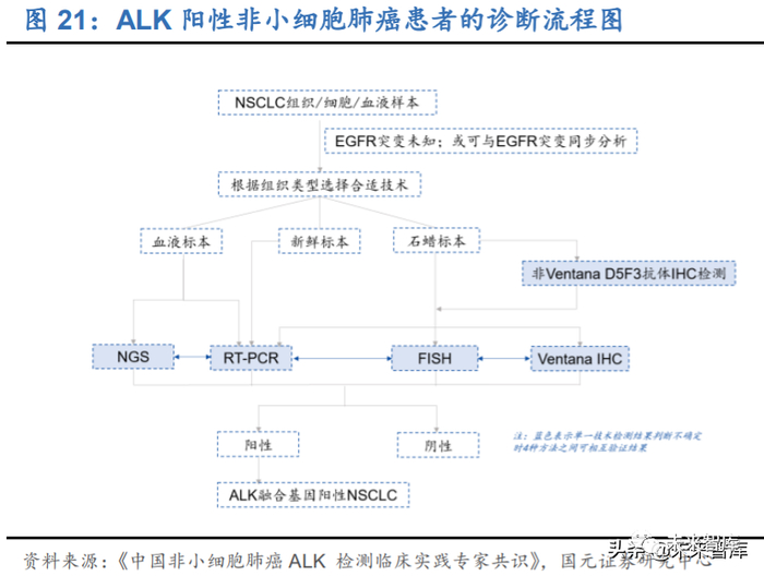 一些特定基因检测往往需要结合多个诊断手段,提高检测准确率。以 ALK 基因检测 为例,根据《中国非小细胞肺癌 ALK 检测临床实践专家共识》,Ventana-D5F3 IHC、 FISH、RT-PCR、NGS 四种技术均可用于 ALK 基因融合检测,但没有一种方法可 以保证 100%准确率,在检测时需要根据具体情况结合多个技术以避免出现漏检、错 检的问题。