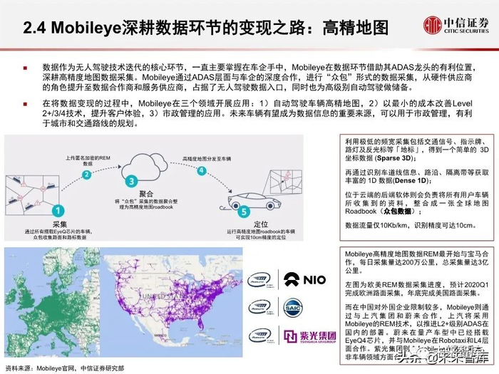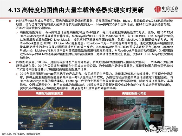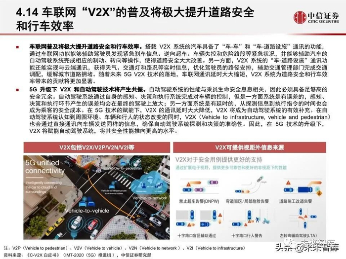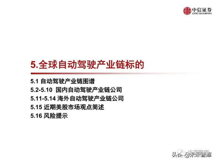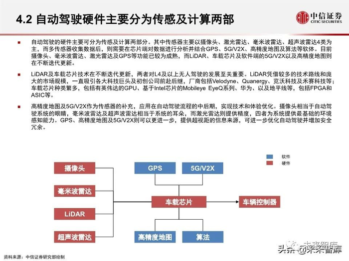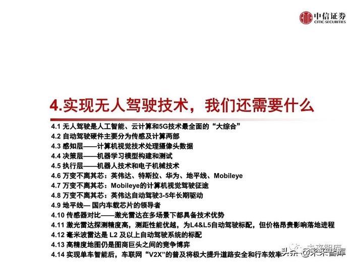 对比人类驾驶员,摄像头相当于自动驾驶系统的眼睛,毫米波雷达及超声波雷达相当于系统的耳朵,而激 光雷达则提供精度和3D模型,四者各有优势,为系统提供全天候全方位的环境感知能力。LiDAR及车载芯 片技术在不断迭代更新,参与的巨头及初创公司包括谷歌、Velodyne、Quanergy、览沃科技及禾赛科技等。车载芯片包括有英伟达的GPU、基于Intel芯片的Mobileye EyeQ系列、华为以及地平线等,包括FPGA和 ASIC。GPS、高精度地图及5G/V2X作为传感器的补充,提供超视距的信息来源。所以“多样性+冗余性” 的软硬件配置是无人驾驶的关键。我们认为2023-2025年将会出现由领先科技公司主导的各场景L4-L5商用 车量产;而2025-2030年,乘用车智能驾驶渗透率将会从50%往80%提升,并从ADAS往L4级别迈进。