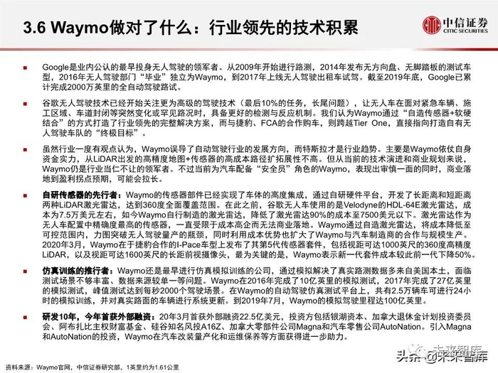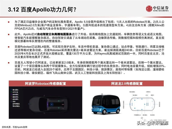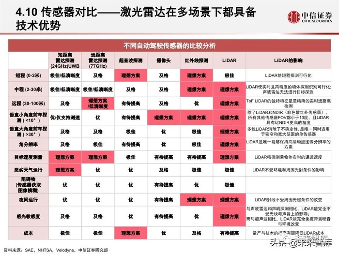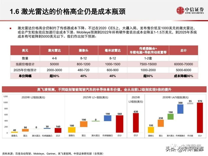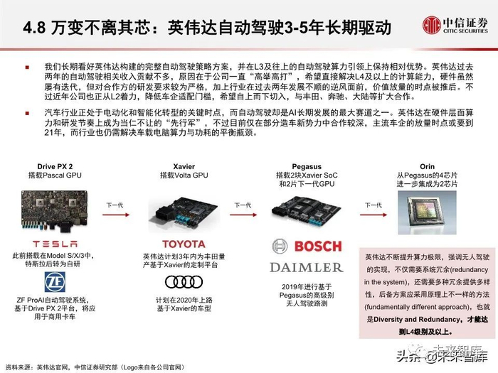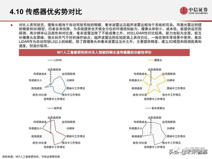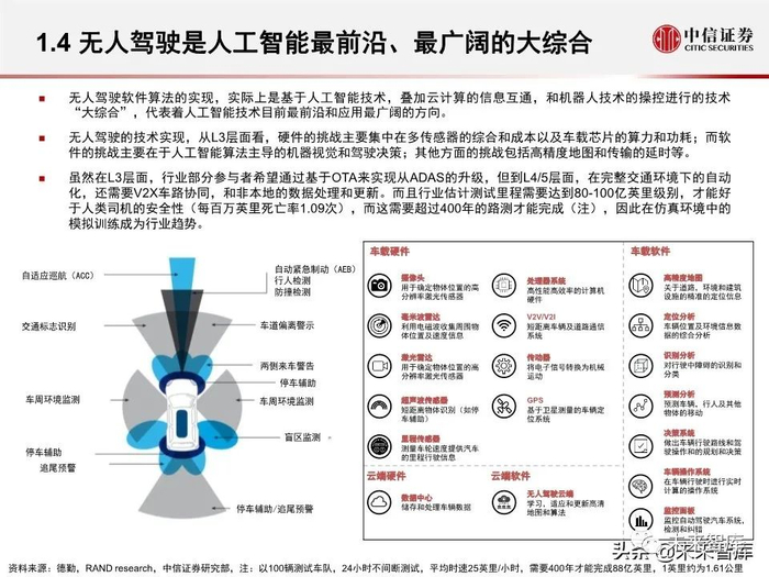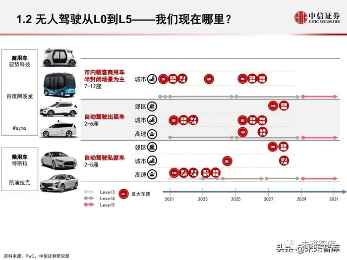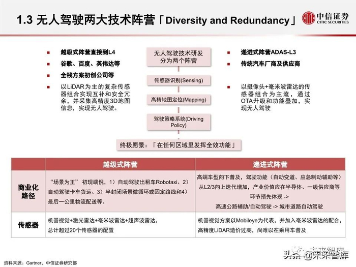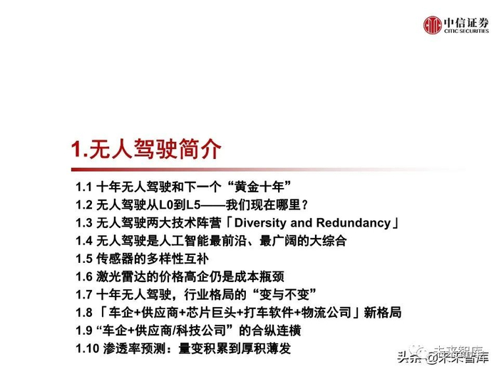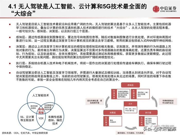 多样性+冗余性,无人驾驶是传感器、芯片、人工智能、云计算和5G技术最全面的“大综合”;预计2023和2025年商用车和乘用车将迎来拐点。