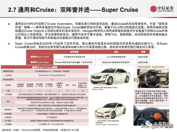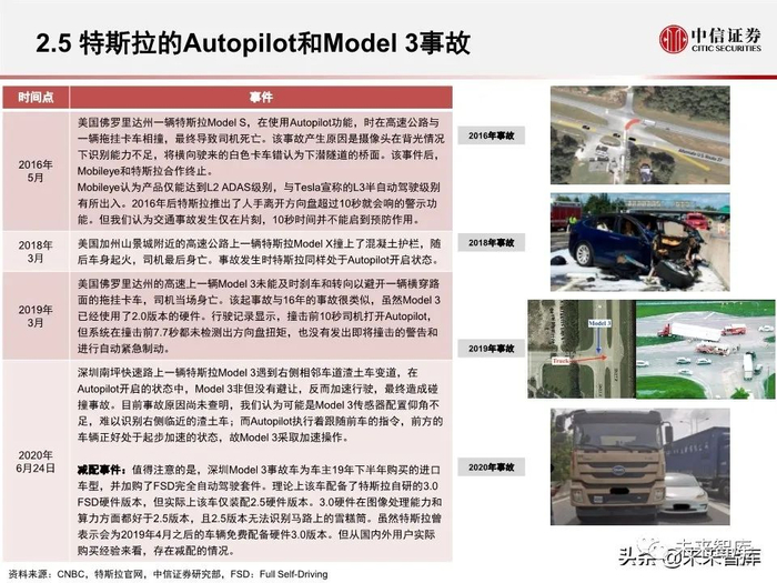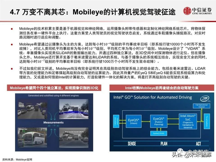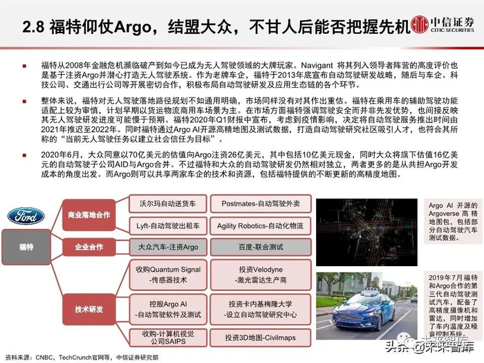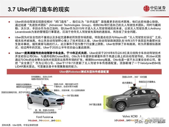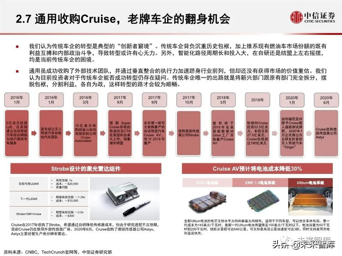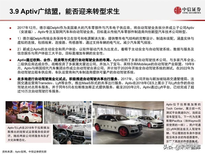 在新老车企的角力中,特斯拉能相对成功的推进汽车电动化和智能化,我们认为主要鉴于他们是一家新兴 的企业,没有传统车企的包袱、内部政治和利益博弈的干扰。特斯拉的产能虽然远低于传统车企,但投资 者也愿意给予估值溢价。反过来,投资者对于传统车企能否成功转型存在疑问,所以均未能获得市场的价 值重估。我们认为传统车企唯一的出路就是将新部门完全拆分出来,摆脱包袱,分割利益,各自为政。特 斯拉作为全球电动车企龙头获得市场认可,其虽在更高级别的智能驾驶技术上尚未完全成熟,但已足够让 传统车企感受到革新压力的迫切性。老牌车企通用和福特均通过收购技术团队,展现较强的变革决心。而 宝马、大众、奔驰等欧洲车企,则通过同行协作和产业联盟,务求共同落地。中国乘用车在自动驾驶上则 受益于政策保护,虽起步较晚,但拥有相对大的成长空间。国内传统车企跟欧洲车企的路径类似,同样依 赖产业联盟共同发展,如上汽-Mobileye、广汽-腾讯、长安-地平线等。而国内造车新势力的自动驾驶主要 依托外部技术,如蔚来-Mobileye、理想-Mobileye/地平线、小鹏-英伟达等合作结盟。我们认为国内的传统 车企同样面对“创新者窘境”问题,而新兴企业则先需要提升产能和销量规模。