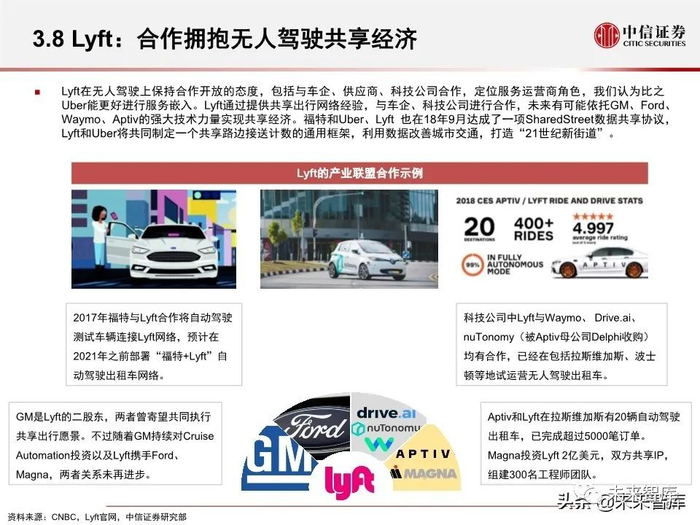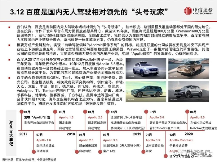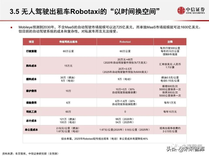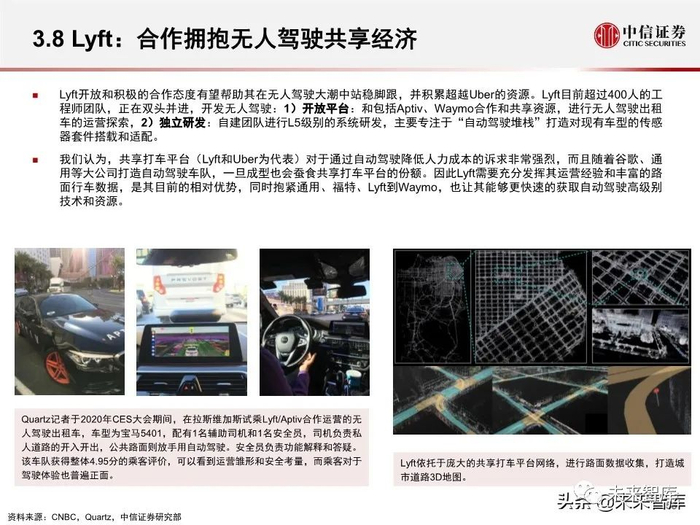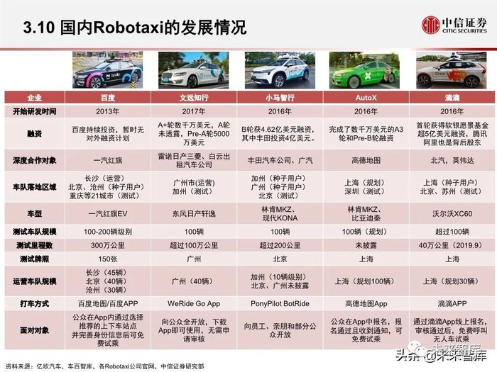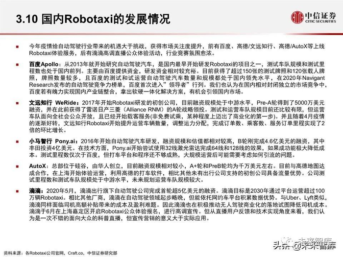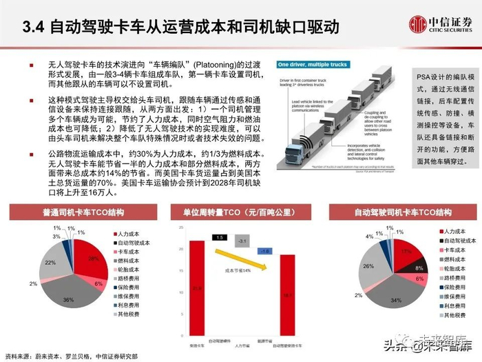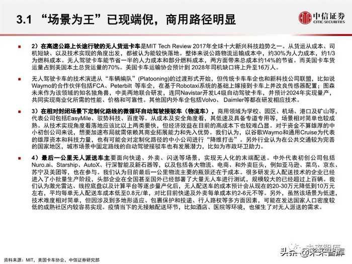 Robotaxi在技术实现难度上是最高的,所以玩家以科技巨头和行业巨头为主,如谷歌的Waymo、腾讯和阿 里参股的滴滴出行、百度、通用和福特等。而Robotaxi的商业落地是典型的“以时间换空间”模式,也是 通往消费级完全自动驾驶的必经之路。虽然欧美公司技术积累较深,商业探索较早,但中国持积极开放态 度也是国内Robotaxi落地测试与运营迅速发展的催化剂。在高速公路上长途行驶的无人货运卡车是MIT Tech Review 2017年全球十大新兴科技趋势之一。从货运成本、司机短缺以及技术实现的角度,都被认为 能较快落地。公路物流运输成本中,约30%为人力成本,约1/3为燃料成本。无人驾驶卡车能节省一半的人 力成本和部分燃料成本,两方面带来总成本约14%的节省。美国卡车运输协会预计到2028年司机缺口将上 升至16万人。传统卡车车企和新科技公司联盟,比如说Waymo的合作伙伴包括FCA、Peterbilt 等;独角兽 图森未来连同Navistar开发L4级自动驾驶卡车,并预计2024年实现量产。