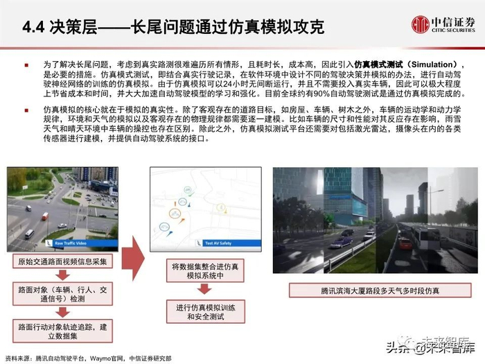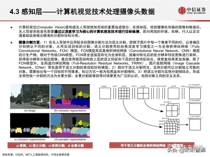 无人驾驶是目前人工智能技术最前沿和应用最广阔的方向。从基于机器学习和机器视觉算法,叠加5G和云 计算的信息互通,到机器人操控的技术“大综合”。无人驾驶的处理流程可划分为:感知层、决策层、以 及执行层。通过传感器接收到图像视觉、雷达信号和地图信息等,进行分类处理,再通过学习建模,由模 型处理传感器等数据、识别路况、预测车辆和其他对象的行为,最终作出车辆行为决策,并结合电子机械 技术作出执行。