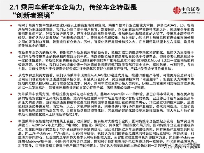 乘用车新老车企角力,传统车企转型是“创新者窘境”,新兴车企没有历史包袱,乘用车发展L3递进式更为合适。