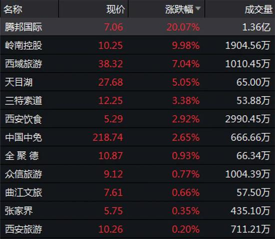 细分下的旅游板块更是表现突出。创业板品种腾邦国际大涨20%封上涨停。免税概念股岭南控股上涨9.98%。西域旅游、天目湖涨幅均超过5%。