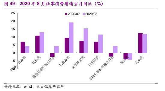 具体来看,2020年8月社会消费品零售总额同比增0.5%,前值下降1.1%。可选消费中,日用品、化妆品、黄金珠宝零售额同比增速提升明显,汽车零售金额继续高增长,家电、纺织服装零售额增速也有一定回暖。