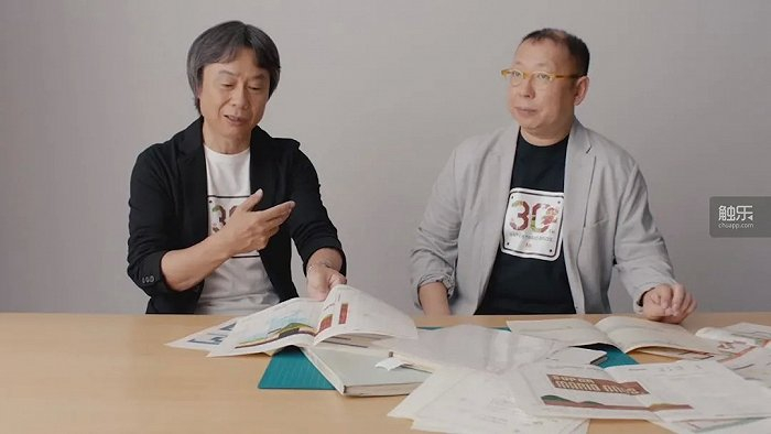 初代马力欧问世30年后,宫本茂(左)和手冢卓志(右)在某次活动中向玩家展示了当年制作游戏时手绘的草稿和设计图纸