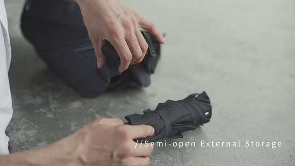 而且跟传统快取收纳区不一样,它把这个收纳区藏在了包包中间,把水杯、雨伞放进去的时候,不会破坏R1整体的美感,而且存取也是十分方便,下雨天一秒就能把伞拿出来打开。