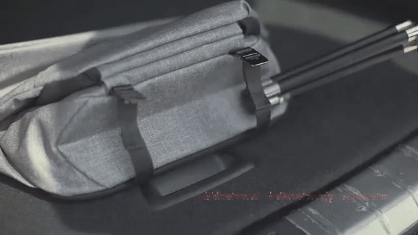 包包底部设计了两个束带扣,它的灵感来自于相机包、军用包和露营包,它可以把三脚架或者体积比较大、不方便收在包里的东西固定在包包上面,随身带走。
