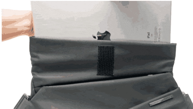 主仓的磁吸开关是翻盖设计,而且可以折叠,空间内最大可以存放12寸的iPad Pro,然后用背部的魔术贴进行固定。