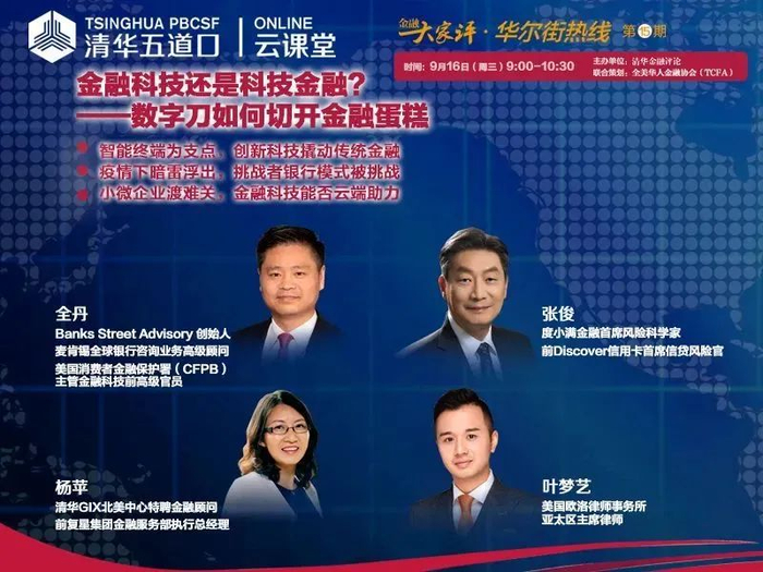 9月16日(周三)9:00,华尔街热线(第15期)特邀BANKS STREET ADVISORY创始人、美国消费者金融保护署(CFPB)主管金融科技前高级官员全丹、度小满金融首席风险科学家、前Discover信用卡首席信贷风险官张俊,与清华GIX北美中心特聘金融顾问杨苹、美国欧洛律师事务所亚太区主席律师叶梦艺展开对话,分享金融科技的新技术、新模式,以及金融科技在疫情后助力小微企业的实践应用!