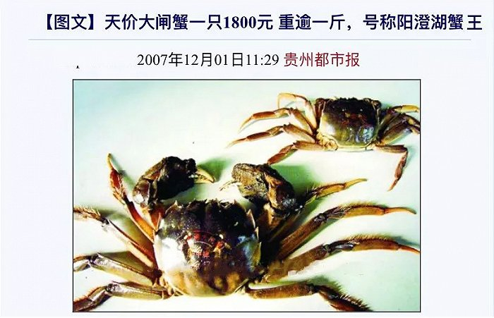 早在2007年,贵州都市报有个新闻报道,在当地一家阳澄湖大闸蟹专卖店,展示有两只“阳澄湖蟹王”,每只标价1800元。