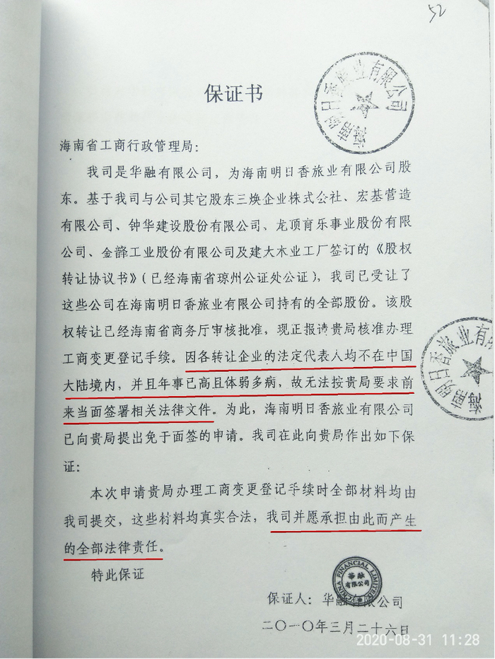 一个很重要的细节是,2007年4月20日,海南明日香向海南省工商局提交了一份《承诺书》,称“我公司在这次办理企业股权变更、法定代表人变更、企业类型变更、董事会成员备案时所提交的文件、资料是真实、合法、有效无误的。目前尚缺投资者资格证明及周仲良身份证明等文件,如因提交的资料造成的后果,由我公司承担一切法律责任”。