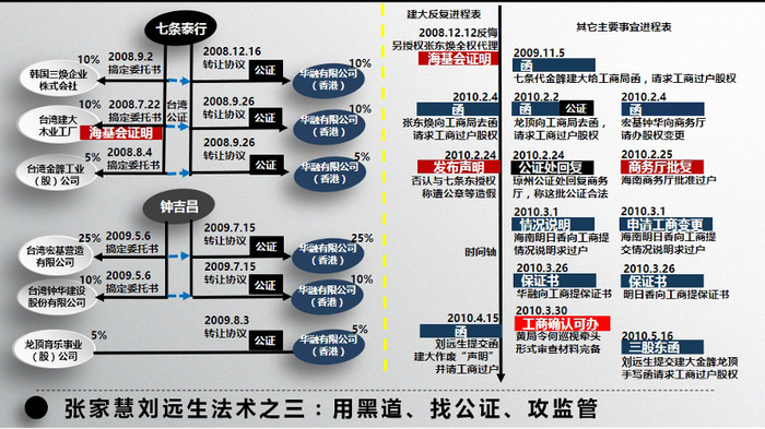 第三转的精彩,一在耗时2年搞定6家股东上,其中建大木业又反复,宏基营造与钟华建设时控人钟维炫的后人被分化瓦解,哥不同意妹同意,哥不服至今;二在海南省商务厅和工商局在点头前,各原股东、现股东及海南明日香的真假函、情况说明、变更保证书、公证书,公证回复漫天飞舞,不经专业人士长时间调查,一时很难辨别真假。最终,工商也只能以“形式审查符合要求”放行。 《等深线》记者 程维 制图