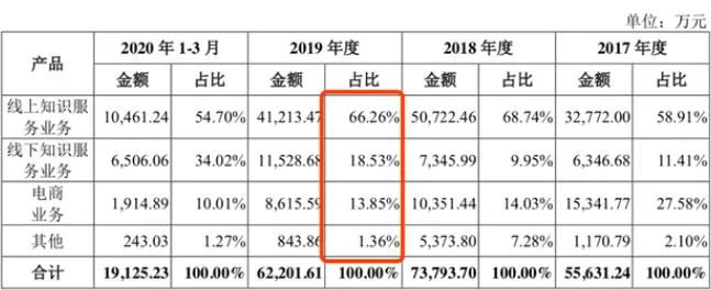 围绕着“得到”App,在线教育是思维造物的核心板块。招股书显示,2020年1-3月,线上知识服务业务营收占比仍然超过五成。