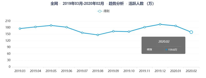 不过,据易观千帆数据显示,得到近年App月活呈现下降态势。 进入2019年后,得到App月活下降至200万以下,最低还跌过150万月活以下。最近半年来,得到App月活基本上维持在180多万,最低为2月份159.8万。