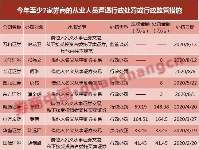 与此次大通证券相关员工因未销户而被监管点名相比,员工违规炒股可算是多家券商的心病。今年以来,至少已有7家券商的从业人员因借他人名义从事证券交易遭遇行政处罚或行政监管措施。