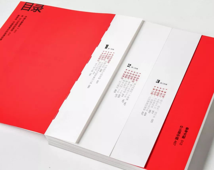 为了呈现三级阶梯,目录设计上将不同章节分别印制在不同的页面上,直接做出物理层面上的隔离,直观醒目。