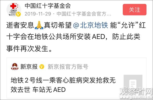 确实,2019年11月,又一名男性乘客在北京地铁2号线心脏病突发,经群众、地铁工作人员、急救人员抢救无效死亡,其所在车站无AED。“中国红十字基金会”官方账号转发这则消息并留言:逝者安息,真切希望@北京地铁 能“允许”红十字会在地铁公共场所安装AED,防止此类事件再次发生。