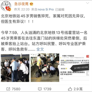 “北京地铁站45岁男销售猝死,家属对死因无异议,但医生有异议!!!”25日晚,微博大V@急诊夜鹰 的发帖获得大量转发及关注。