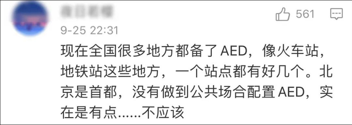 几天后,《北京商报》也曾在《AED离我们有多远》一文中提到,北京朝阳医院心脏中心副主任医师田颖曾联合从事AED行业的朋友试图捐助AED给北京地铁,但最终未能成行:“当时和地铁相关部门联系,他们表示没有政策、没有地方放、没有许可,最后就没做下去。”谈起AED,望京站等多个地铁站工作人员表示,“没有,听都没听说过。”相比之下,北京的机场和不少商场配备有AED。
