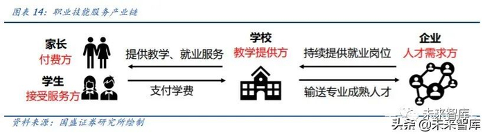 职业技能培训就业导向的办学模式是核心,就业压力推动需求端增长:学校通过优质教 学体系为企业培养和输送人才,而稳定的校企合作关系则是学校吸引学生、家长愿意为 之付费的核心优势,由此形成职业技能培训产业链生源和就业资源的正向循环,品牌效 应应运而生。