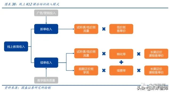 传统线下培训机构/纯在线培训机构/互联网公司均布局线上 K12 课后培训业务。一方 面,新东方、好未来两大线下龙头机构进军线上,拥有线下积累的师资力量及品牌优势, 在线上竞争中体现为获客成本低且续班率较高。另一方面,纯在线平台充分利用互联网 经济,早期通过在线营销投放获客和完成品牌打造,2019 年暑期,学而思网校暑期营销 投入约 10 亿元,线上 K12 课后培训全行业暑期营销投入超过 50 亿元。从培训的商业模 型看,要实现长期稳定盈利的根本是优质教学和服务质量,取决于平台的教研、用户运 营和教师管理能力。