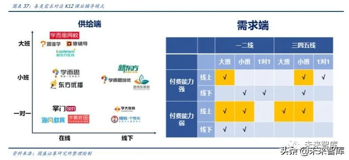 类比线下,线上也演变出不同教学模式匹配不同需求。1)1 对 1:以学霸君、作业帮等 机构为代表在 2015-2016 年推出一对一业务,在此之前 2014 年互联网公司先行探索尝 试。2)大班课:2018 年以来逐渐成为线上的主流模式。目前采用线上大班辅导模式的 品牌包括学而思网校、猿辅导、跟谁学、新东方在线。3)小班课:小班课模式为 30 人 以下小班进行线上教学。目前小班模式还在探索阶段,新东方在线旗下的东方优播、学 而思线上培优均采用小班模式。