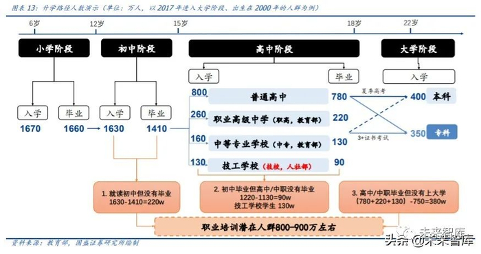 我国升学路径筛选机制为职业培训提供充足的需求基础。经过层层考试筛选洗礼后,每 年 1600 万入读初中的人群中,每年进入普通高中和职业高中的比例在 50%和 50%,高 考后最终仅 400 万人进入本科和 340 万人进入专科院校接受高等教育,余下的 800-900 万均是每年进入职业培训市场的潜在需求人群,整体需求大盘充足。以东方教育为代表 的职业培训机构,长期班面临的主要竞争对手是学历类职业教育学校,短期班主要竞争 对手来自于非学历职业培训机构,主要目标客群为年龄 15 岁至 21 岁学生。