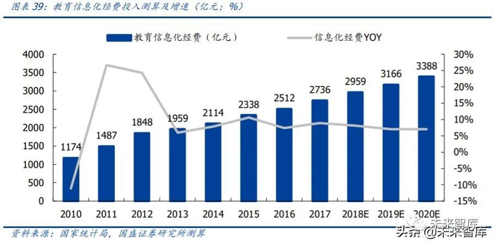 信息化经费投入驱动行业增长,预计 2020 年投入将达 3400 亿元。2011 年 6 月教育 部发布的《教育信息化十年发展规划(2011-2020 年)(征求意见稿)》提出,“各级政 府在教育经费中按不低于 8%的比例列支教育信息化经费”,而国家财政性教育经费支出 占国内生产总值比例一般不低于 4%2。2018 年国家财政性教育经费 3.42 万亿,同增 8.94%,占 GDP 的 4.14%,连续第五年超过 4%,以此测算,2018 年国家教育信息化 经费超过 2900 亿元,到 2020 年教育信息化经费投入将达约 3400 亿元。