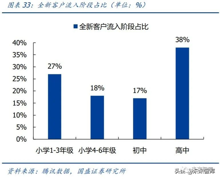 在线模式渠道下沉明显,升学竞争压力支撑需求。根据腾讯数据调查报告,疫情期间 K12 在线教育用户中全新流入用户下沉趋势明显,二线城市占比最高,且 84%的用户未来仍 有意愿选择线上课程,平均单节课可承担费用水平约为 75 元。从学生层次看,初高中占 比较高,可见应试竞争压力或是参与培训的核心动力。