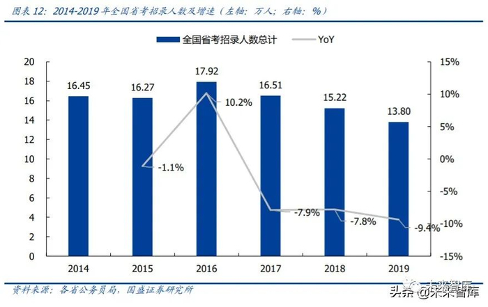 疫情影响招录时间延后,各条线招录名额显著增长。受疫情影响,国考面试以及省考、 事业单位、教师招录等细分赛道相较往年时间均有所延后,5-6 月进入公告密集披露期, 根据目前已有招录公告可见各省扩招力度有所加大,以省考为例,目前除河北省外,其 他地区 2020 年省考公告全部出台,我们统计 30 各省市自治区、新疆兵团共招录 15.49 万人,同增 20.2%,招录。今年省考联考将于 7 月 25 日和 8 月 22 日举行。