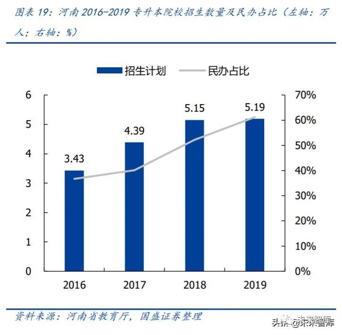 专升本生源逐渐由民办高校承接。专升本院校中各省公办院校数量通常与民办院校相当,但从招生数量看,近年民办院校承接数量占比逐渐提升,以生源大省河南省为例,专升 本民办院校招生占比由 2016 年的 36.7%快速提升至 2019 年的 61.2%,因此专升本扩招 将有望为优质民办高校直接贡献招生增量。