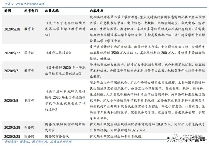 高教+职业教育成为“稳就业”重要载体,扩招稳步推进。2 月 28 日 10 时,国务院联 防联控机制举行新闻发布会,教育部副部长翁铁慧明确了今年将扩大硕士研究生招生和 专升本规模,预计同比分别增加 18.9 万、32.2 万人;5 月 22 日国务院政府工作报告明 确提出今明两年职业技能培训 3500 万人次以上,高职院校扩招 200 万人;5 月 28 日教育部印发《关于在普通高校继续开展第二学士学位教育的通知》鼓励 2 年全日制学士培 养;此外 4 月至 6 月期间,各省积极响应国务院基础岗位扩招,陆续确定选调生、三支 一扶等岗位招录人数。今明两年扩招大势已定,岗位扩招与高等教育扩招并举,高教与 职业教育成为扩招推进的重要载体。
