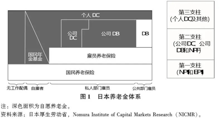 国家管理为第一支柱,国民养老保险(NPI,即“国民年金)覆盖全体国民,缴费和养老金给付都是固定数额,每人相同。然后是雇员养老保险EPI,即厚生年金)缴费率为18.3%,由雇员和企业分担,为“待遇确定型“(DB)”,覆盖全体企业和公务员。国民年金和厚生年金都为现收现付制,无累积型个人账户。