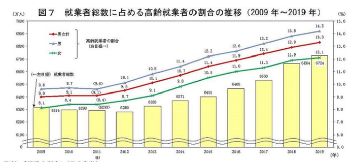 同时,2019年日本65岁以上就业人数比2018年增加30万人,连续16年增加,达到了892万,为历史最高水平。