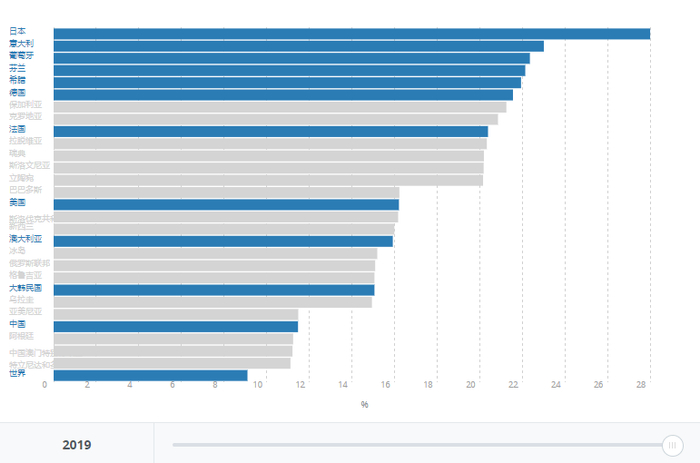 就全球横向比较而言,日本老年人就业率全球排第二,第一位为韩国。2009年韩国老年人的就业率为30%,这一数字到2019年上涨至32.9%。