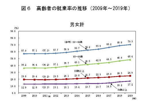 据总务省最新公布的数据显示,日本老年人就业率已连续16年上涨,2019 年65-69岁的老年人就业率为48.4%,70岁及以上的老年人就业率为17.2%。