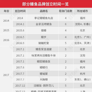 例如,2017年创立于北京的鳗鱼家居酒屋、活鳗饭·鹅肝范儿,上海的鳗樽·炭烤活鳗居酒屋、将·鳗鱼前辈,深圳的大腕鳗,杭州的鳗鳗行、鳗诚屋;2018年创立于上海的鳗葉、鰻享屋日本料理,西安的鳗吞吞等。