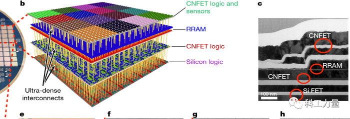 该教授2017年发表在《自然》杂志论文中报告的芯片,拥着四个集成电路层,并拥有5个子系统。其中负责实验样品蒸汽数据采集、传输和处理的部分是碳纳米晶体管构建的,而电阻随机存储单元(RRAM)和接口电路是由硅晶体管构建的。毫无疑问,这是一个碳基+硅基组合型的气味探测芯片,而不仅仅是碳纳米晶体管构成的。