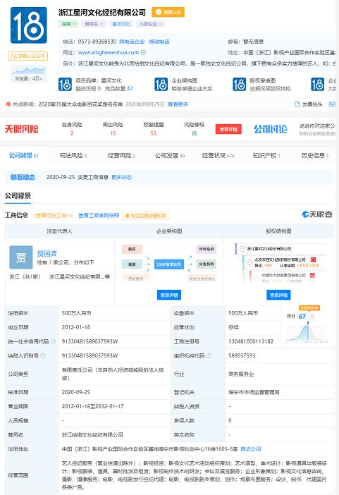 天眼查App股东信息显示,浙江星河文化经纪有限公司由北京文化的关联公司北京京西文化旅游股份有限公司(000802.SZ)全资持股,据北京文化官网介绍,王京花为北京文化·星河文化董事长。