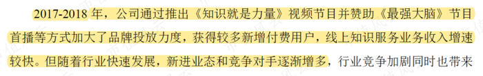 2018年的增长主要是因为公司推出《知识就是力量》视频节目并赞助《最强大脑》节目首播等加大品牌投放。