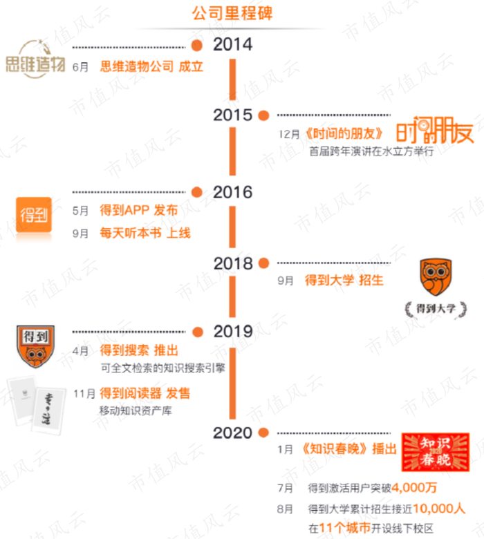 从2014年成立,到2015年末推出《时间的朋友》跨年主题演讲,2016年推出得到App,再到2018年还整出了个得到大学,2019年推出阅读器……到现在要来创业板上市了,从成立至今也不过6年时间。
