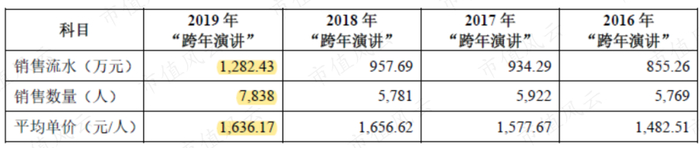 从门票来看,公司跨年演讲的销售实现了稳步增长,2019年销售流水达到1282万,平均单价1600元左右,比较稳定。