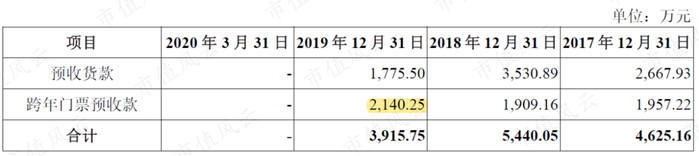 2019年末,跨年门票预收款2140万元,而到了2020年三月底,仅剩下843万,这意味着多半预收已经在前三个月确认为收入。