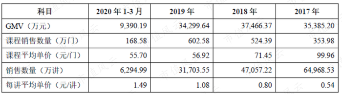 但是,2019年课程交易总额(GMV)同比是下降的,从3.7亿降至3.4亿,降幅8%。大致观察,GMV和公司收入数据差异不大,主要原因如下: